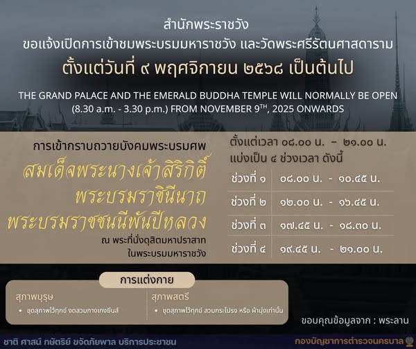 สำนักพระราชวัง ขอแจ้งเปิดการเข้าชมพระบรมมหาราชวัง และวัดพระศรีรัตนศาสดาราม
